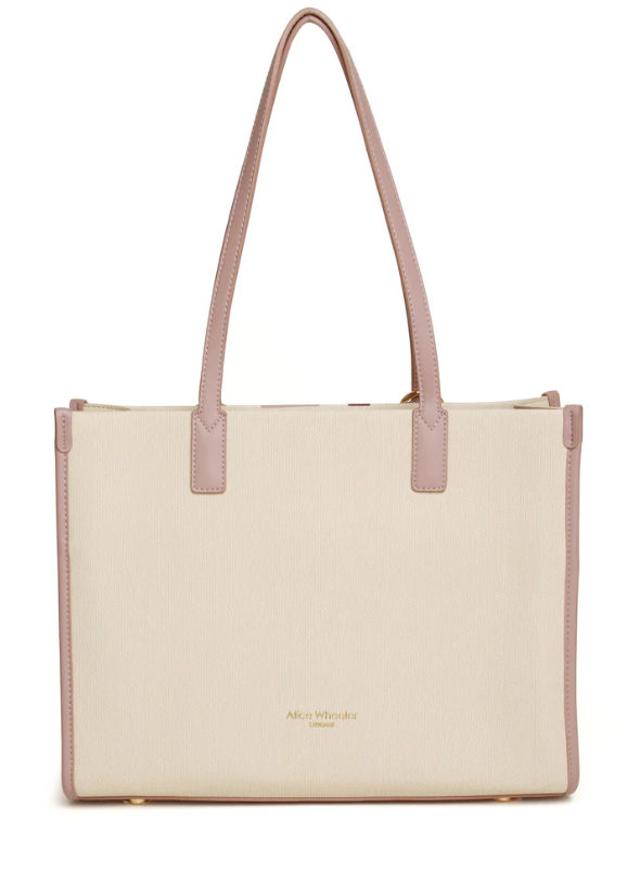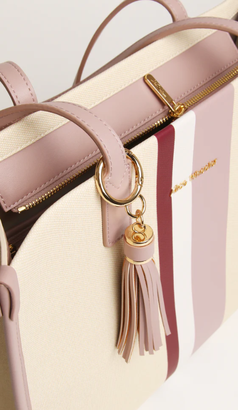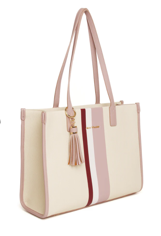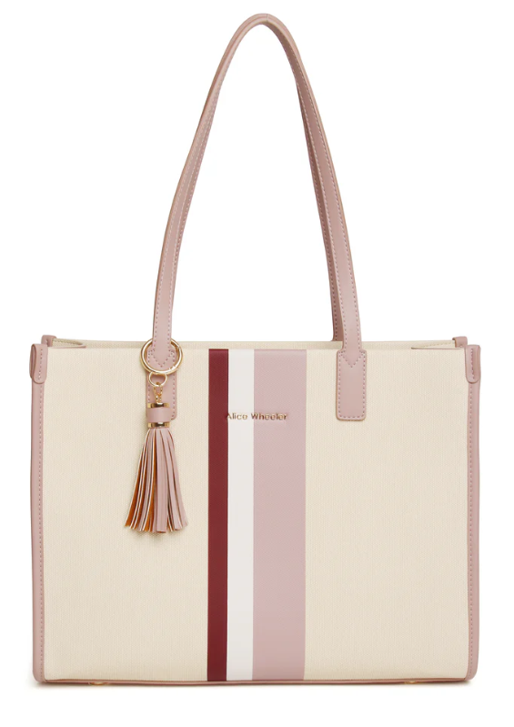 Crafted with dual-toned materials and a striking striped band design, this spacious tote is both stylish and functional. It features a large main compartment, an integrated zippered section for valuables, and plenty of room for your essentials. Finished with Alices new Tassel Charm.