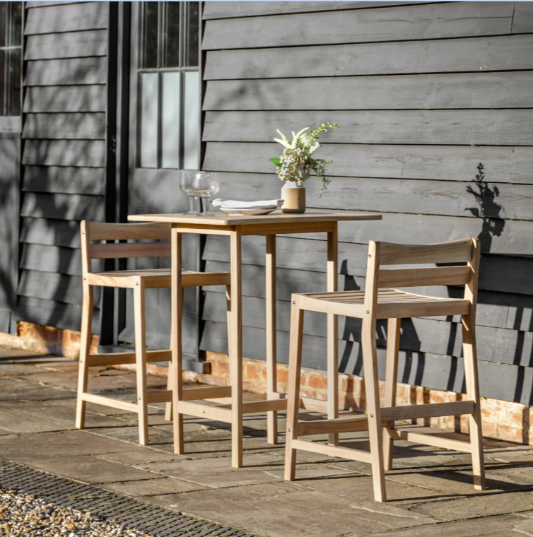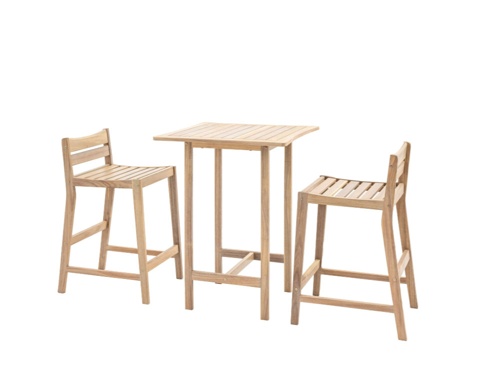 Enjoy an evening drink with this modern and chic bar set. Made from Acacia wood with an oiled finish the set comes complete with a slatted top table and 2 low back bar chairs, all at a slightly lower than normal height for a more relaxed feel.