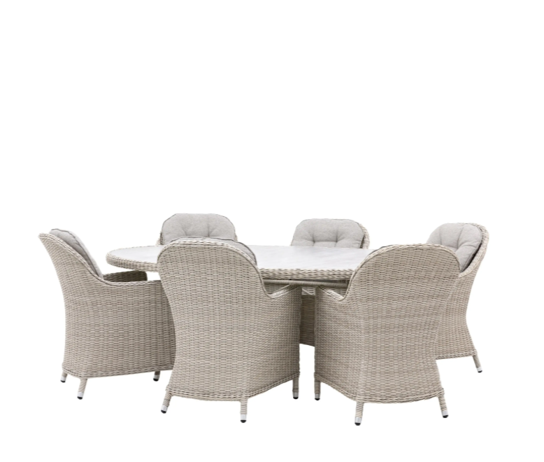 Crafted with a blend of rattan and plush, generously sized cushions, this set offers comfortable seating for you and any guests. The neutral color palette complements any outdoor decor, and the oval table provides ample space for entertaining. Perfect for alfresco dining, this set is a stylish addition to any patio or garden.