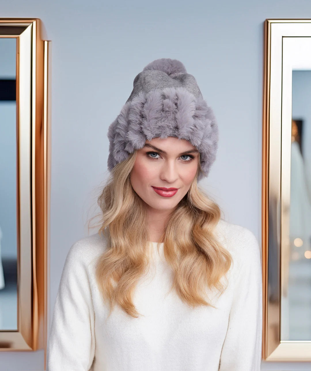 The Silver Grey Bailey Winter Beanie Hat with Pom Pom Hat is ready for the cold weather whether you`re in the city or country. Decidedly weather-ready, it has all the makings of a winter classic. This soft, knitted fabric beanie hat looks classic and urban-chic for the season. Get ready to embrace the cold while you luxuriate in the warmth of its wide faux fur cuff trim. A matching Silver Grey mid-sized faux fur pom pom tops off this hat rounding off its wintery good looks. Plush, luxe, and easy to keep handy in your handbag for whenever the cold strikes or the weather turns.