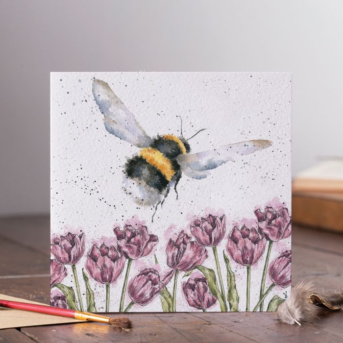 Featuring a colourful bumblebee amongst tulips, this card is perfect for any occasion. The image is printed on high quality, sustainably sourced textured board and is left blank inside for your own message. Supplied with a recycled kraft envelope and measures 150mm x 150mm.