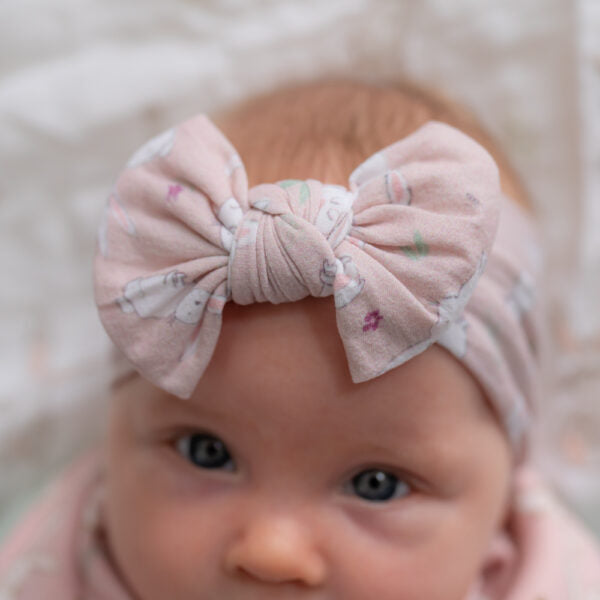 Finish off little outfits with our gorgeous Bunnies Print Headband. This soft Dusky Pink Print top bow turban headband is also available in a matching Ziggle dribble bib to coordinate your baby’s outfit.