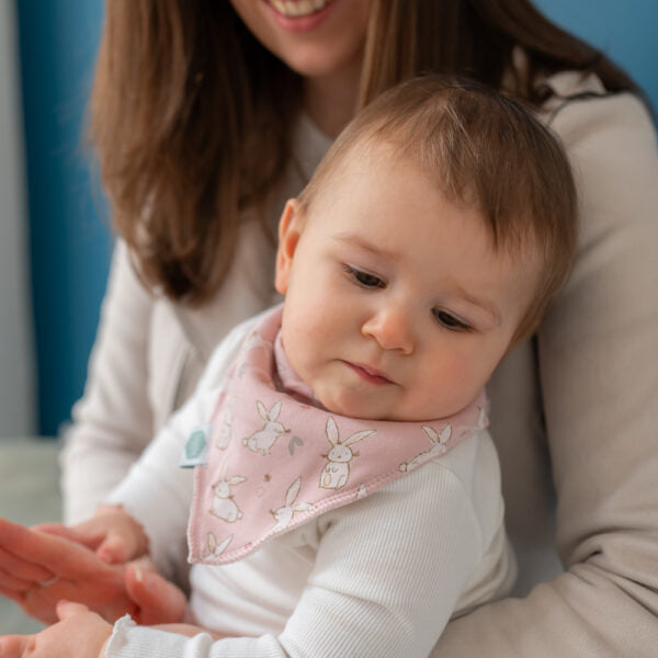Keep baby dry during feeds and endless teething drool with this cute pink bunnies bandana bib. Made from a super soft and absorbent material, this adorable dribble bib can be popped over any outfit for a burst of pink!