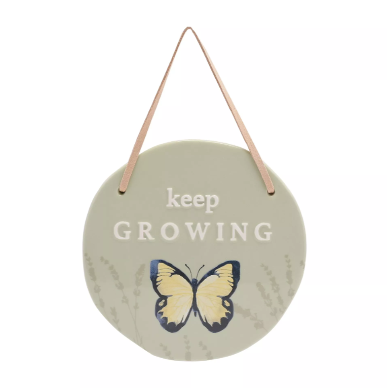 This beautiful plaque makes a welcome addition to gardens for those who enjoy being at one with nature. The ceramic plaque showcases a gloss finish, complete with green colouring, embossed ‘Keep Growing’ title and colourful butterfly illustration. It is designed for outdoor display using the attached leather hanger.