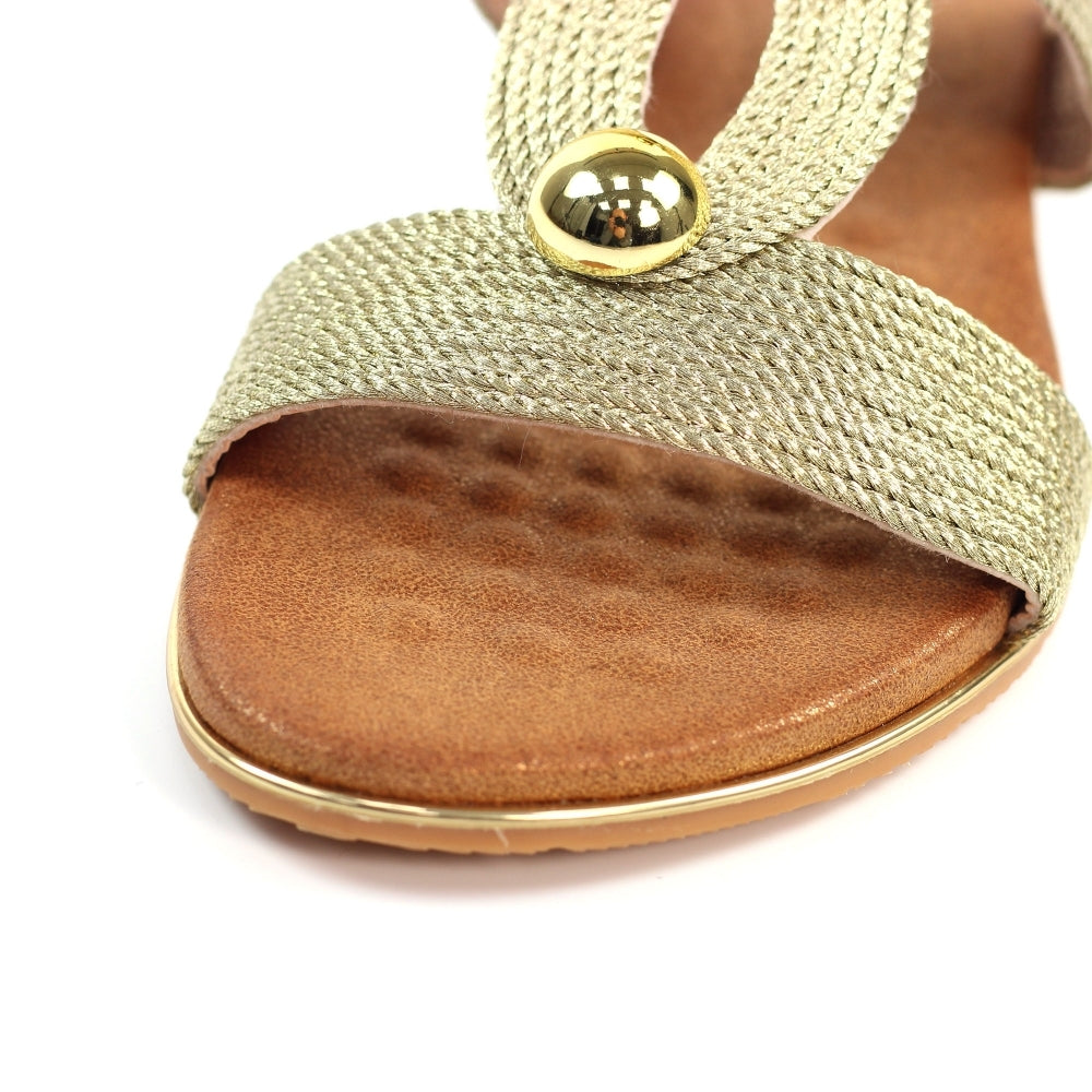 Meet Calow II, a stylish slip-on sandal with a padded insole for comfort and support. Crafted in a woven metallic textile with studs decorating the top and bottom of the T-bar, this mule is perfect for all occasions this summer.