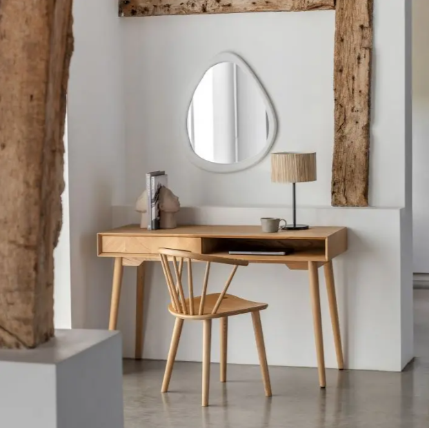 An eye-catching inlay chevron design, combined with a specialist mat lacquer finish to keep the timber looking natural and dry with brushed out grain, gives this desk a tactile appeal. Made using European oak and rustic oak structured veneers which show the natural beauty of the oak grain and knots, this stunning piece, with a single drawer and open storage compartment, offers both style and practicality.