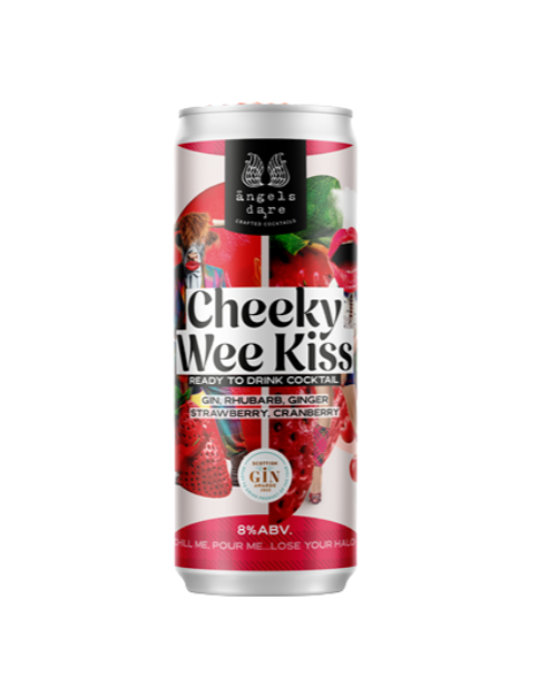 Sweet, spicy, and just a little bit wicked, Cheeky Wee Kiss is Angels Dare’s flirty twist on a gin cocktail. Rhubarb brings the sass, ginger brings the heat, and a burst of strawberry and cranberry keeps things juicy and fresh. All kissed with a smooth gin base and sitting pretty at 8% ABV.