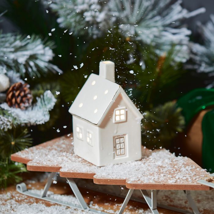 Ceramic LED house in white with gold accents featuring window and door details, illuminated through small cutouts on the roof and walls.