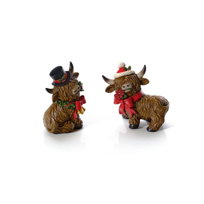 Highland cow ornaments, each brown with large horns, decorated with a red scarf and either a black top hat with holly or a red and white winter hat, featuring additional festive details.