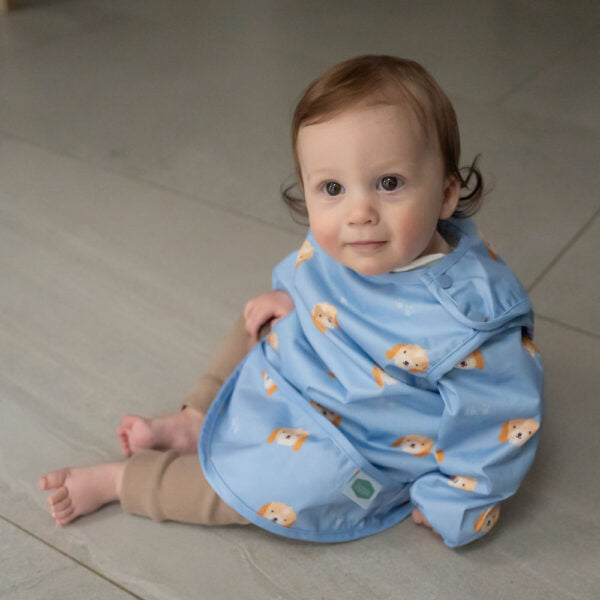 Whether it is meal time or just messy play, our soft, long sleeved waterproof bib in a cuddly cockapoo puppy print with crumb catcher pocket will help keep any little one clean and dry.