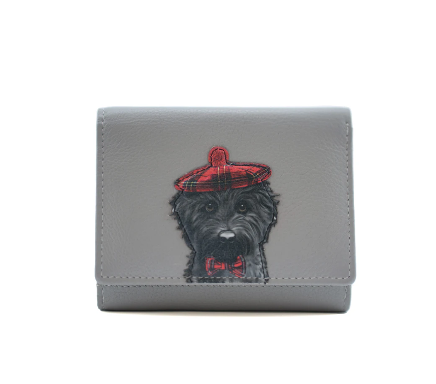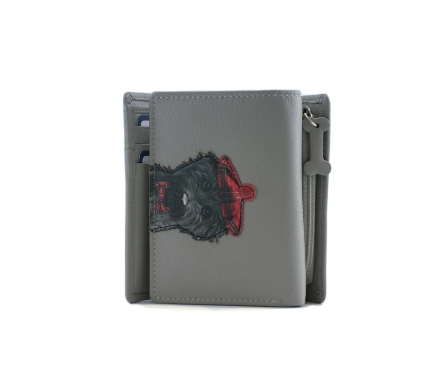 A stylish leather tri fold purse featuring a dog applique in a tartan hat and bow tie, showcasing a charming design.