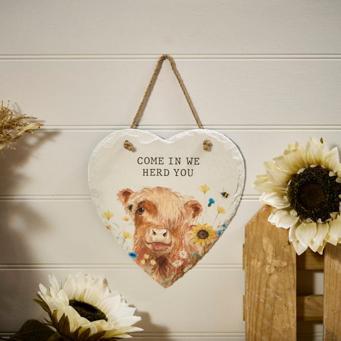 Welcome to the Herd! Keep your home organized and stylish with our heart-shaped slate hanger. Measuring at 22x22x0.6, it's the perfect way to display your heartwarming message. Experience the warmth and charm with Come in we Herd You Slate.