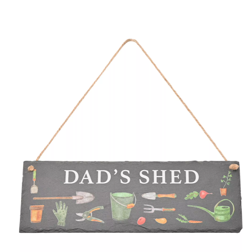 Add a touch of character to any garden with the Country Living Slate Hanging Plaque "Dads Shed". Perfectly capturing the homely spirit of 'Dad's Shed', this slate-coloured sign is adorned with charming illustrations of gardening tools, a watering can, a trowel, and wholesome vegetables.