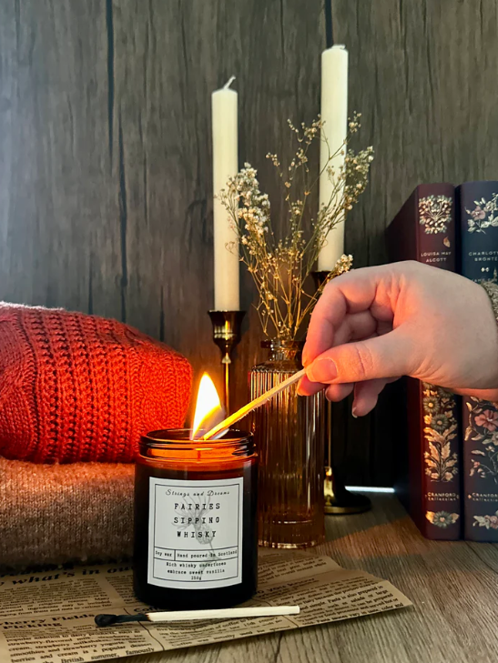 Experience the magic of Scotland's whisky-making tradition with our Fairies Sipping Whisky candle. Rich whisky undernotes embrace sweet vanilla, transporting you to a world of ancient legends and timeless indulgence. It's a scent that captures the essence of Scotland's storied past and vibrant present.