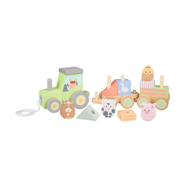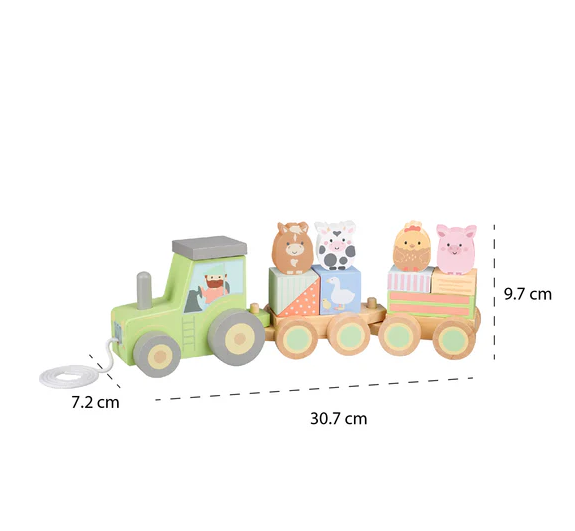 This is the perfect wooden toy for any little budding farmers! Kids will adore playing with this wooden toy tractor. The wooden tractor features a pony, cow, chicken and pig! With brightly coloured blocks, perfectly sized for little hands, the characters and carriages can be taken apart and re-built, and a handy string ensures little ones can pull their train around!