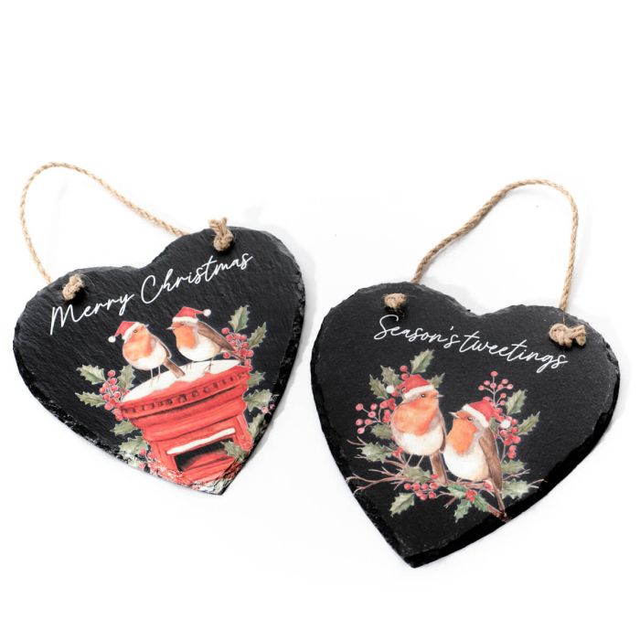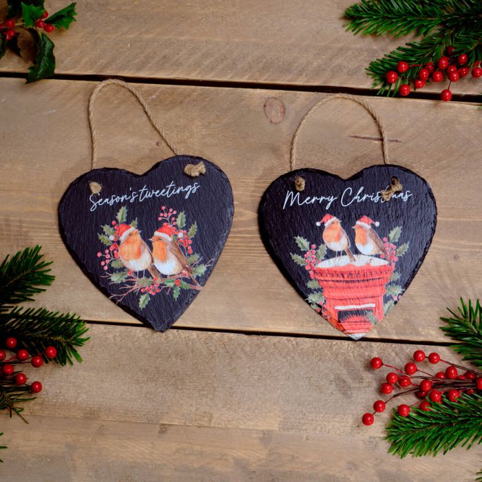 With a jute string for hanging. Both feature images of robins, holly leaves, and red berries; one hanger also includes a red post box. Each has seasonal text: "Merry Christmas" and "Season's tweetings"