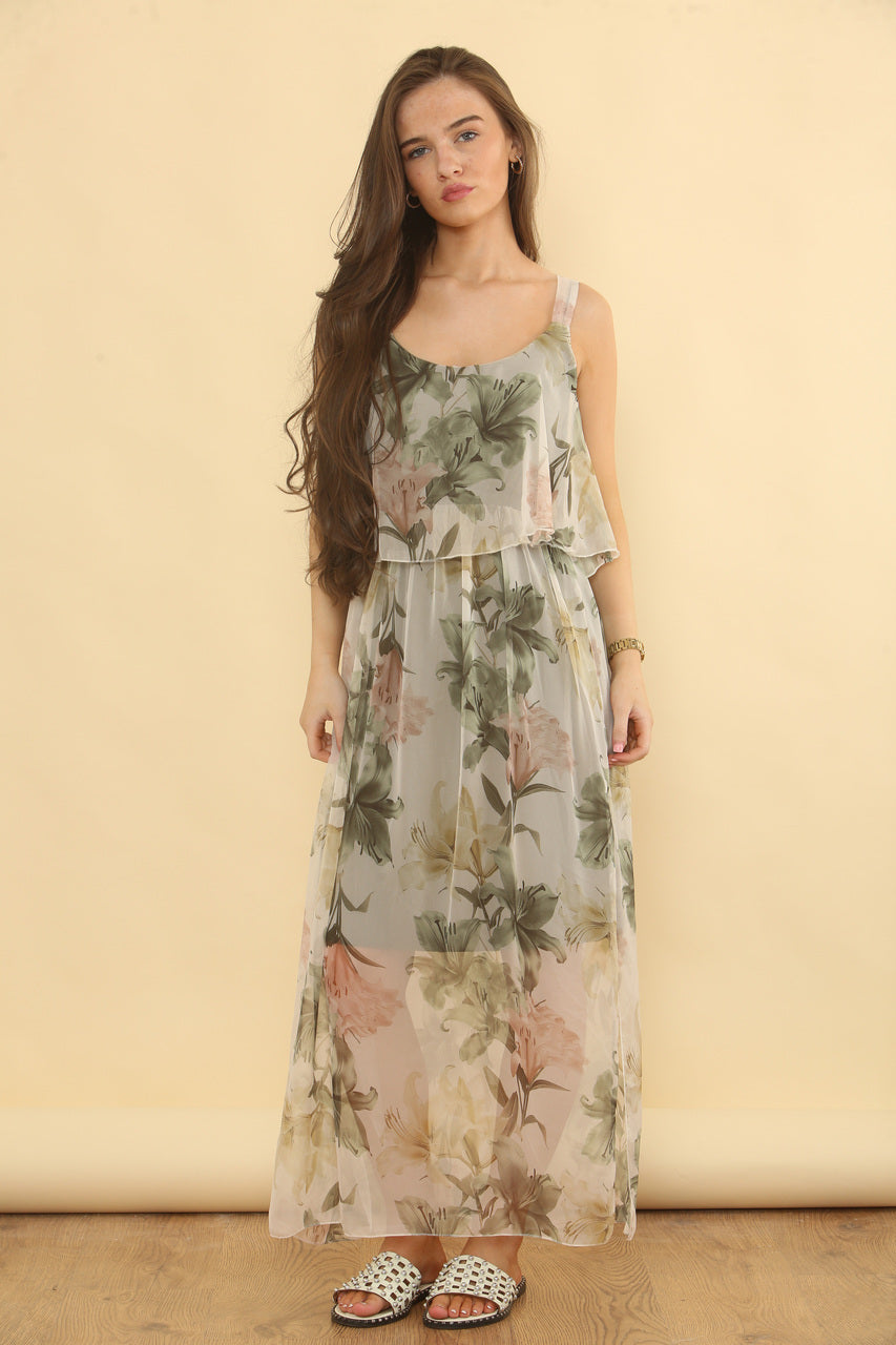 Floaty Tier Floral Print Sleeveless Dress - Khaki