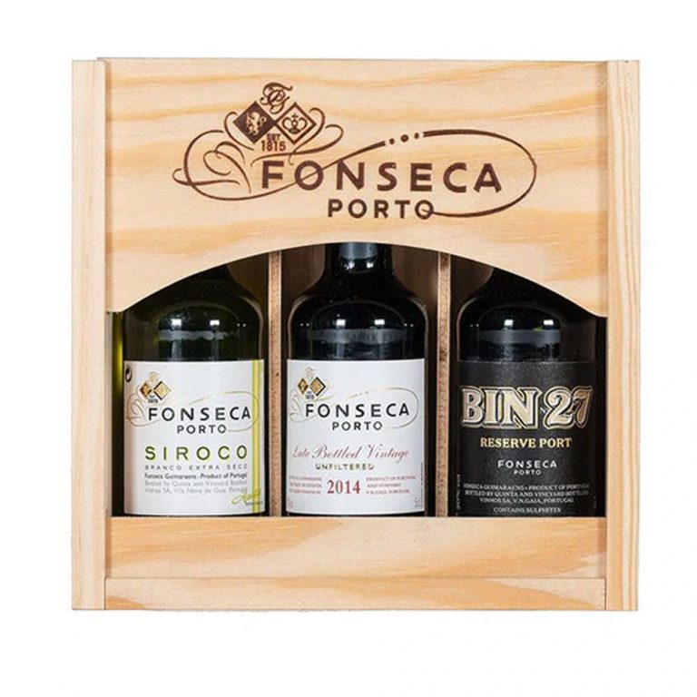 Three miniatures of Fonseca port, including one 5cl bottle each of the following: Siroco white port (best served chilled), Bin 27 reserve port and the 2014 Late Bottled Vintage, all presented in a lovely wooden box with a sliding lid.