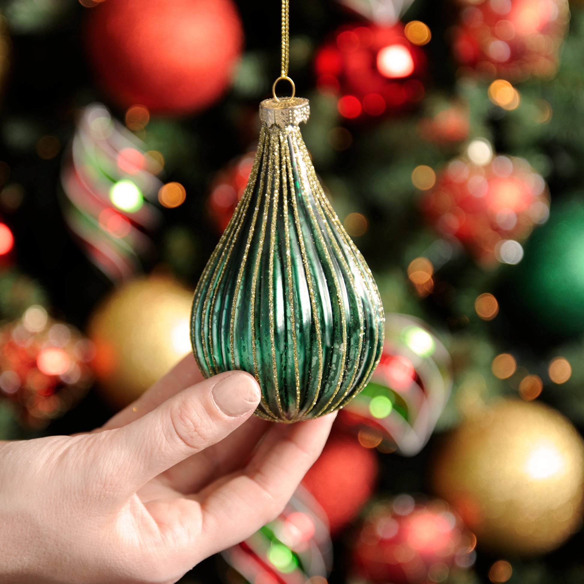 10cm green with gold glitter ridged glass drop