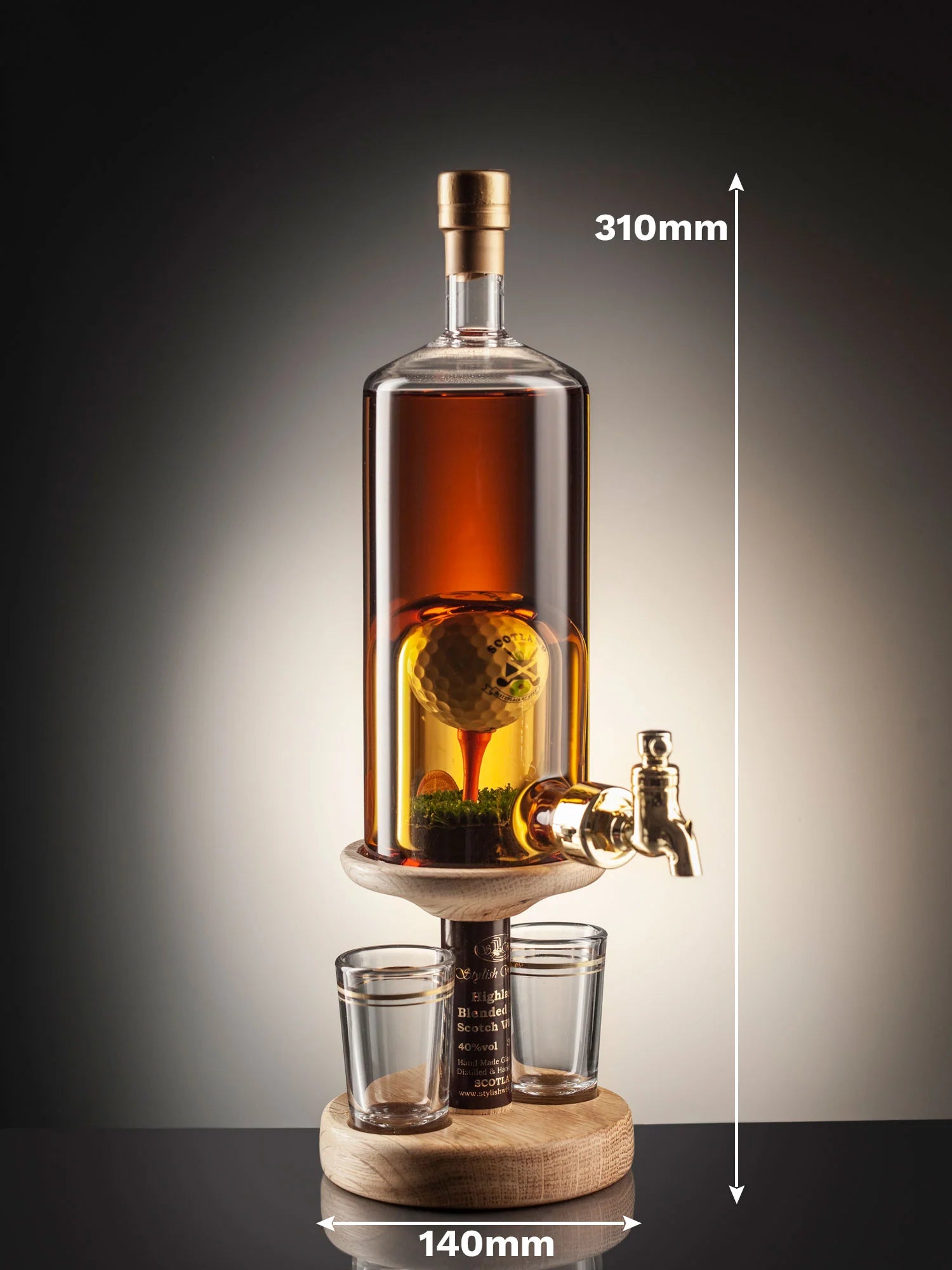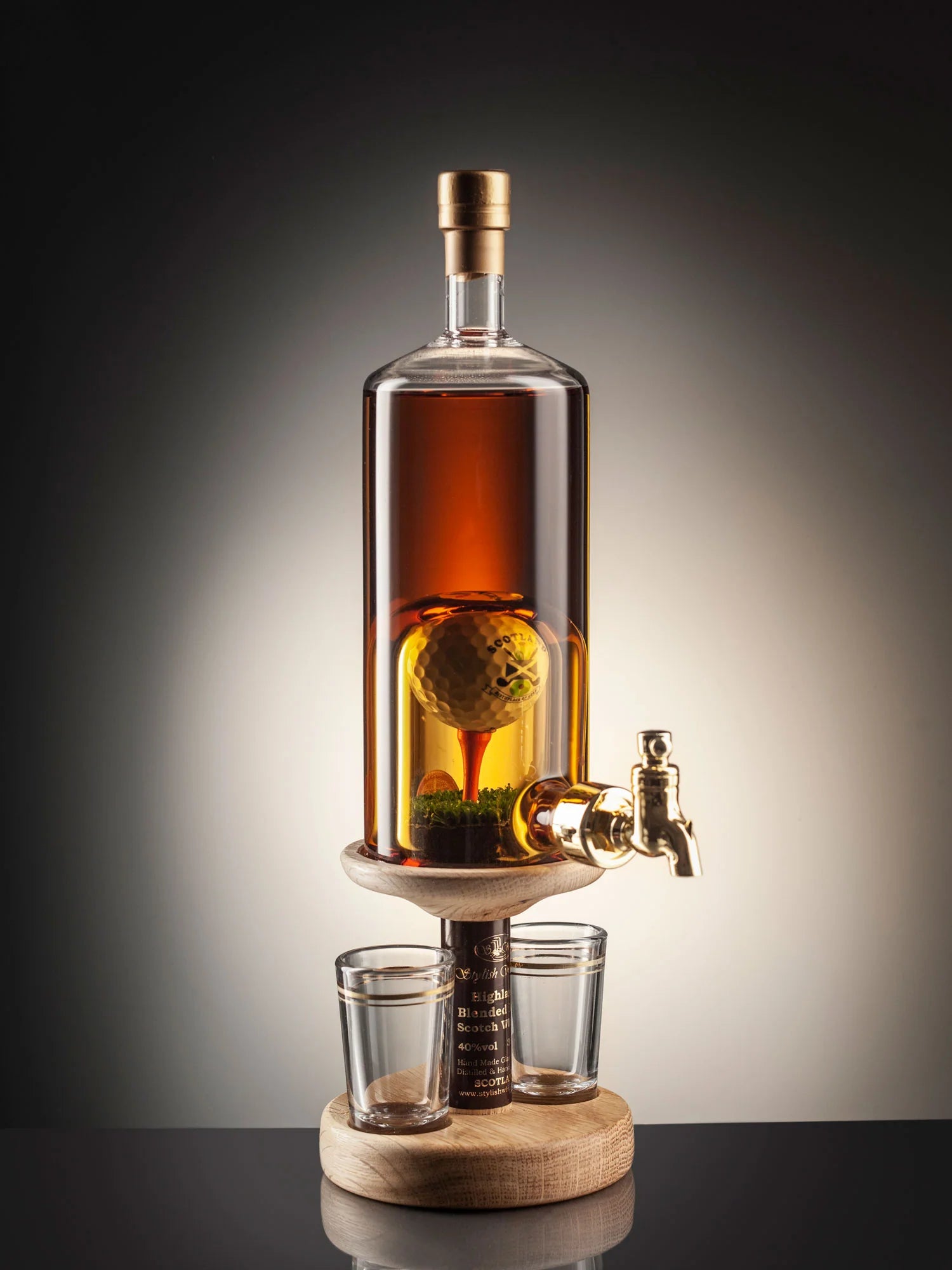 The golf ball and tee are inserted into the hand-blown glass decanter, which comes with working plastic tap and is presented on a stunning oak wooden stand with 2 shot glasses. The golf ball is branded with a Scotland logo, representing the fact that Scotland is the home of both golf and whisky.