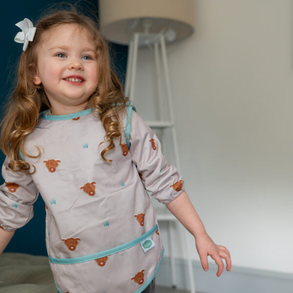 Whether it is meal time or just messy play, our soft, long sleeved waterproof bib in cute highland cow print with crumb catcher pocket will help keep any little one clean and dry.