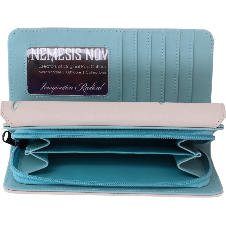 Features detailed embossed highland cow artwork, delicate flower motifs, durable leather, a zip-around closure, and a sky-blue interior with compartments for cards and coins.