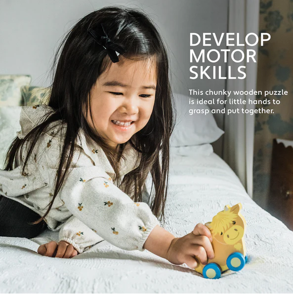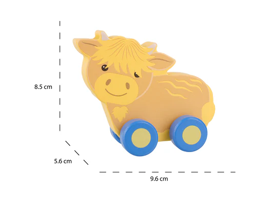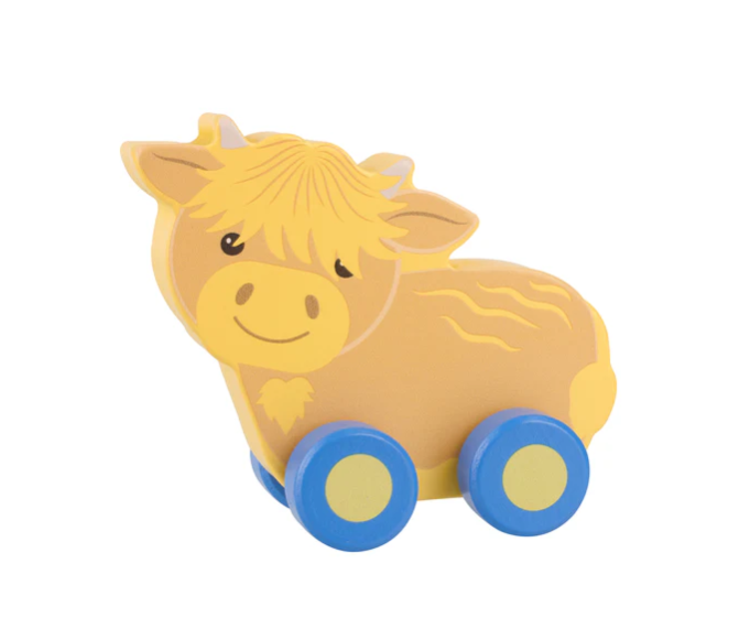 This chunky highland cow first push toy is ideal for little hands to grasp and push along.