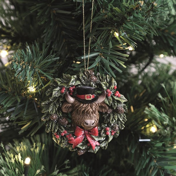 A novelty highland cow wreath shaped hanging tree decoration. The highland cow is wearing a top hat and has a lovely bow around his neck.