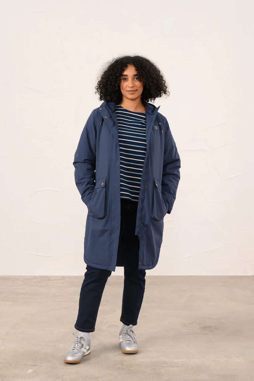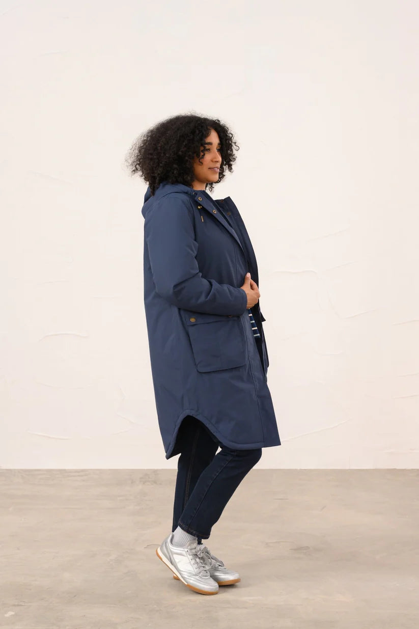 The fleece-lined hood is both adjustable and integral, and the curved shirt hem adds a flattering shape. With deep front patch pockets (complete with side entry) plus secure internal compartments for your phone and valuables, it’s as functional as it is good-looking.