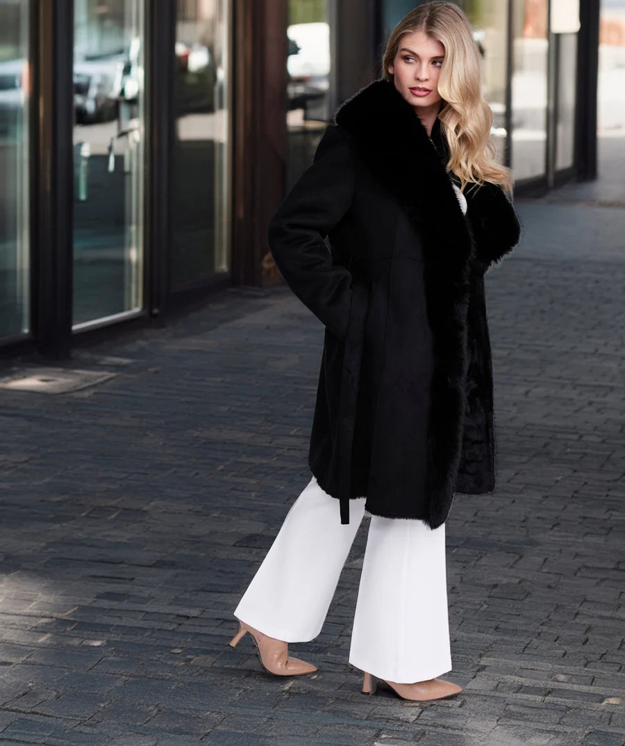 Isabella - Black Faux Suede Longline Coat with Faux Fur Trim