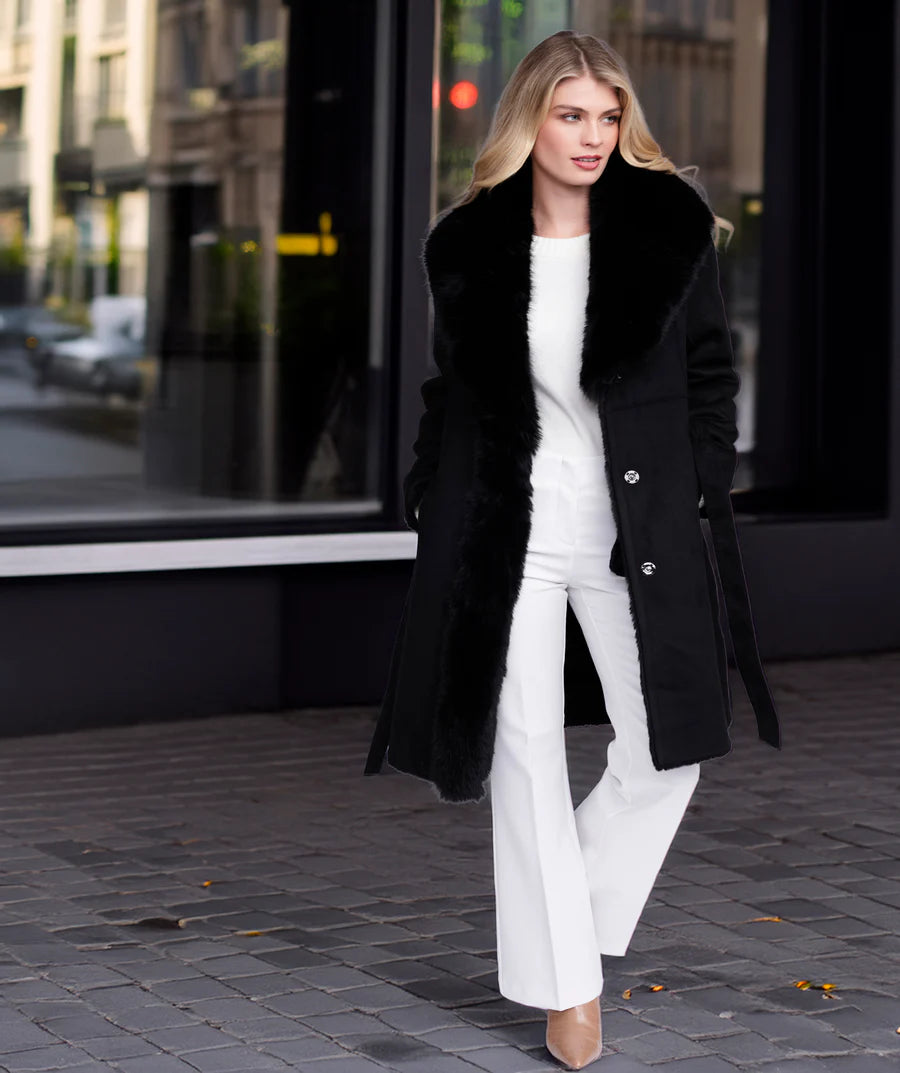 Elevate your winter wardrobe with this Longline Faux Suede Coat, featuring a luxurious faux fur lining for added warmth and comfort. Designed with an elegant tailored silhouette, a tie belt for a perfect fit, and button closure for classic sophistication, this coat blends style and function effortlessly. Perfect for cozy, chic layering all season long!