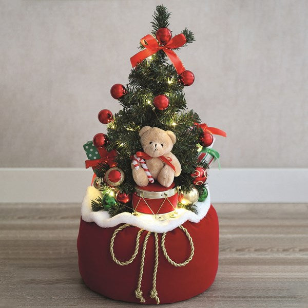 Decorative sack featuring a classic Christmas tree surrounded by presents and toys and lit up by bright LED lights.