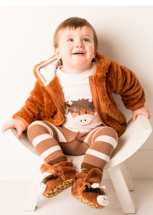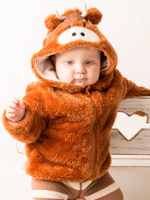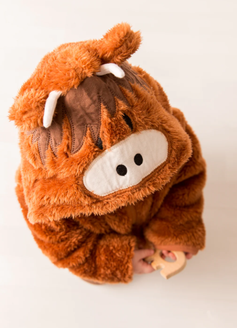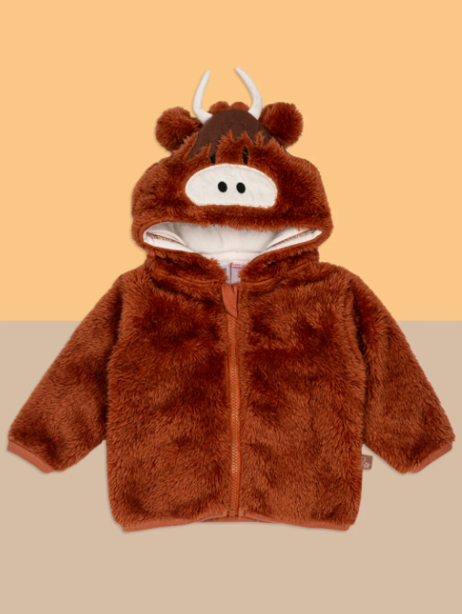 Our new fluffy brown hoodie features a hood with our new Neutral Hamish Highland Cow face with perky ears and horns. Ideal if your little one likes standing out from the crowd or if they love anything nature related!