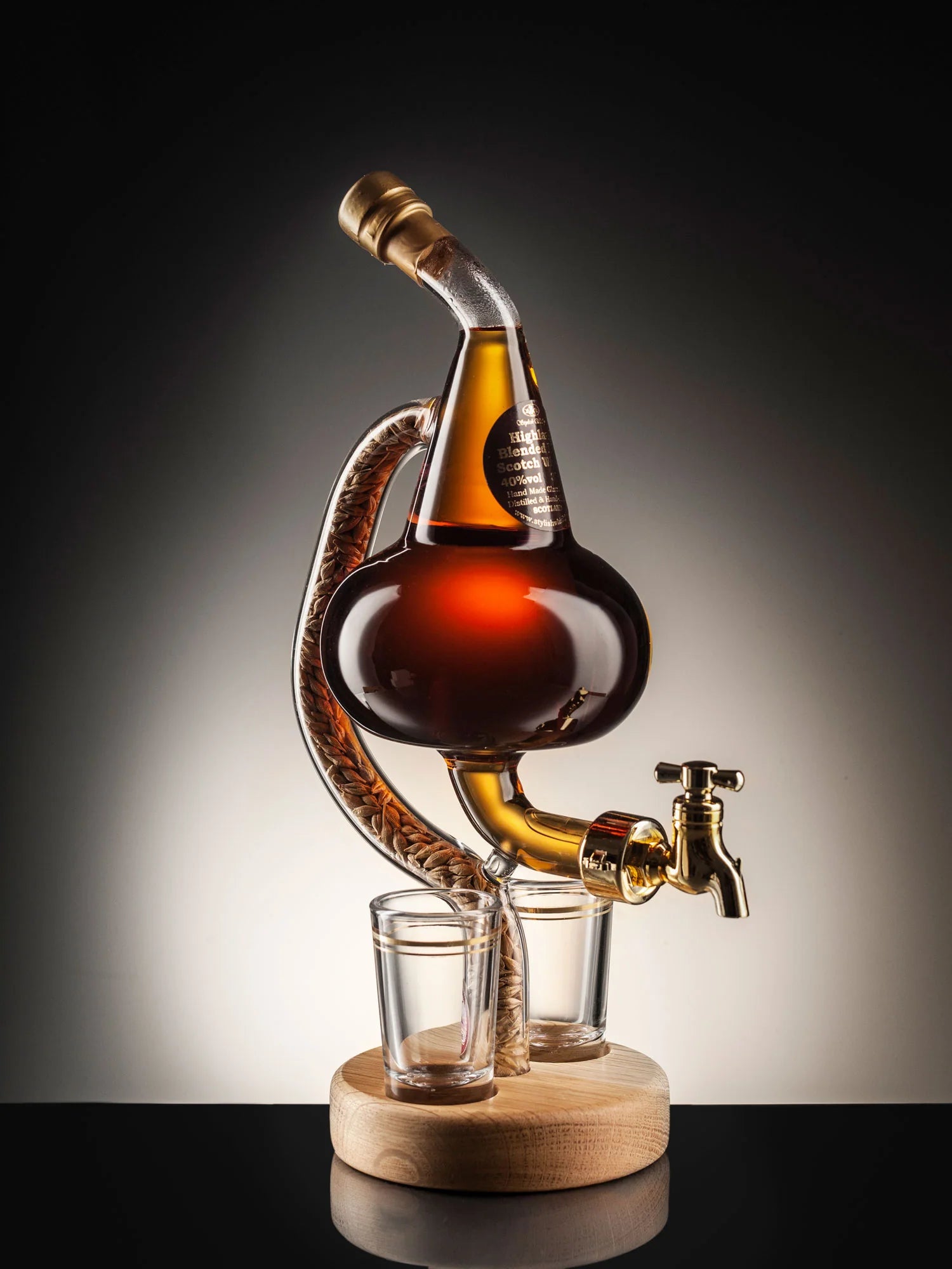 The glass tube comes full of decorative barley kernels, and the spirit is decanted from a gold-coloured plastic tap straight into two special whisky glasses.