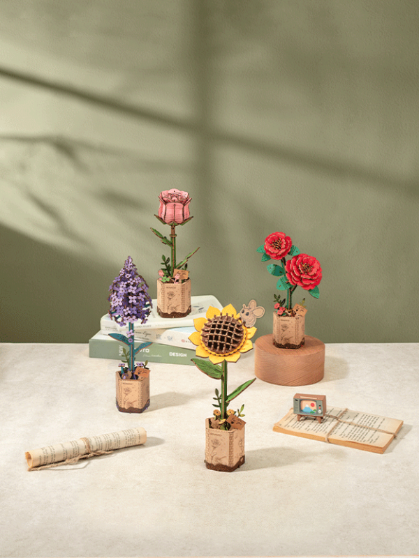 Decorate your life with preservable Robotime-Rowood Wooden Flower Bouquet. This exquisite set features four wooden flowers and plants, including Sunflower, Lilac, Red Camellia, Pink Rose and Eucalyptus, etc.. Each flower comes pre-colored, ensuring it can brighten up the room with its colorful look.