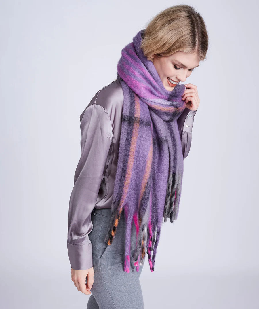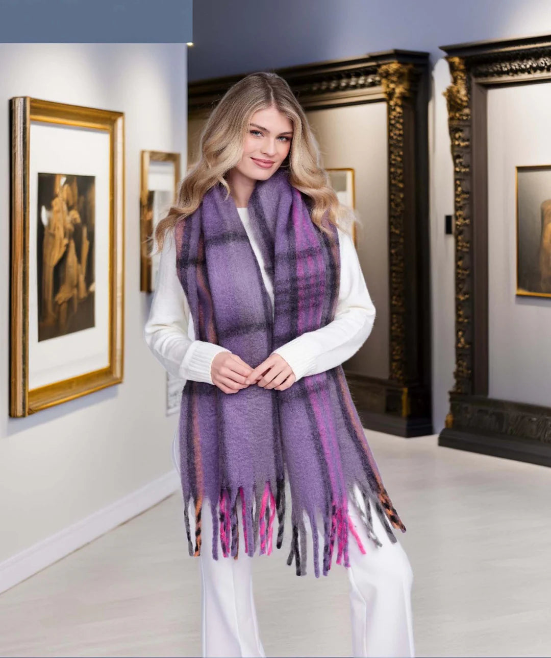 Robyn - Purple Check Blanket Scarf with Fringed Trim
