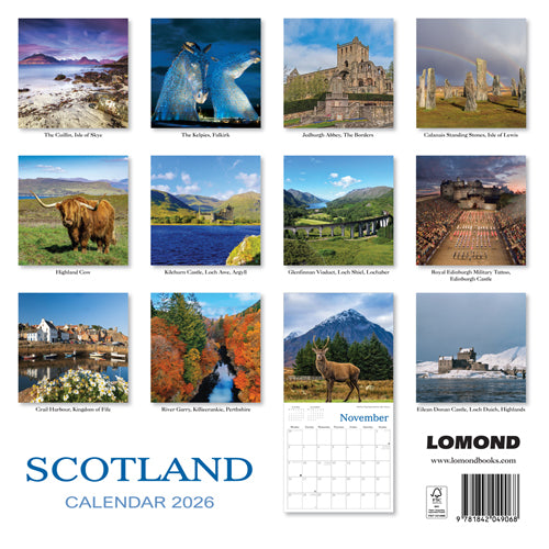 Enjoy wonderful scenic images throughout the year with our range of 2026 calendars. This 24 page wall calendar offers a full page for an image and a full page of date boxes below. The calendar dimensions are 30cm x 30cm (60cm x 30cm when opened). The selection of stunning images of Scotland included are: the Cuillin, Isle of Skye; the Kelpies, Falkirk; Jedburgh Abbey, Scottish Borders; Calanais Standing Stones, Isle of Lewis; Highland Cow; Kilchurn Castle, Loch Awe, Argyll; Glenfinnan Viaduct, Loch Shiel, Lochaber; Royal Edinburgh Military Tattoo, Edinburgh Castle; Crail Harbour, Kingdom of Fife; River Garry, Killiecrankie, Perthshire; Red Deer Stag and Buachaille Etive Mor, Glencoe; Eilean Donan Castle, Loch Duich, Highlands. Our 2026 Lomond Calendars are in plastic free packaging.