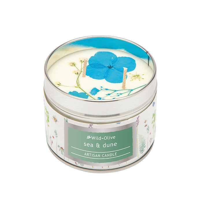 Natural soy candle hand poured and decorated with pressed flowers. Fragranced with the fresh and invigorating aroma of the sea and the wild coastal plants.