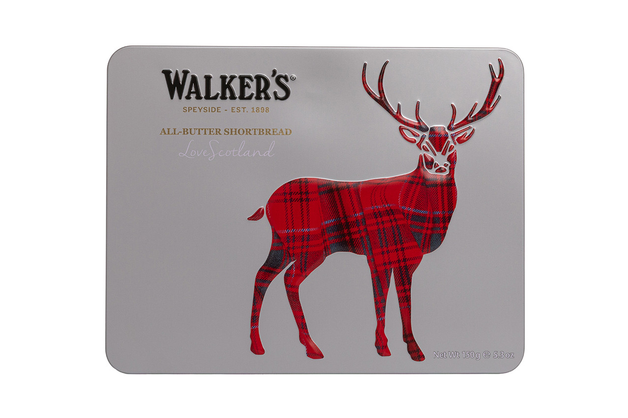 A beautifully presented silver icon tin featuring a stags head cut out from Walker's distinctive red tartan. Filled with delicate pure butter shortbreads in five distinct shapes including thistles, rounds, hearts, triangles and fingers.