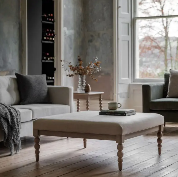 The eye-catching legs on this beautiful coffee table feature hand-crafted bobbin detail which is created by turning the wood on a lathe, a task carried out by the finest craftsmen. The table is made from oak with a very subtle lime wash tone to the finish which is soft and mellow, paired with biscuit coloured fabric for the upholstered seat. Matching pieces are available.