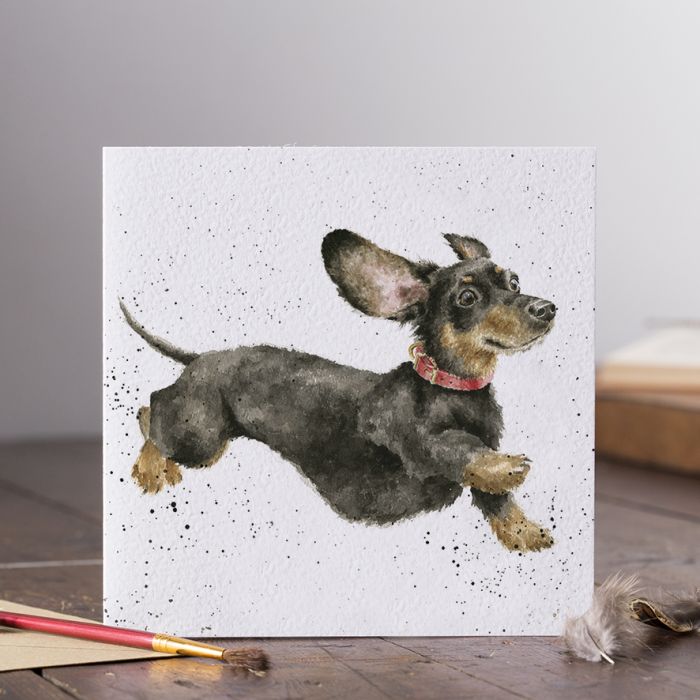 Featuring a lovely leaping dachshund, this card is perfect for any occasion. The image is printed on high quality, sustainably sourced textured board and is left blank inside for your own message. Supplied with a recycled kraft envelope and measures 150mm x 150mm.