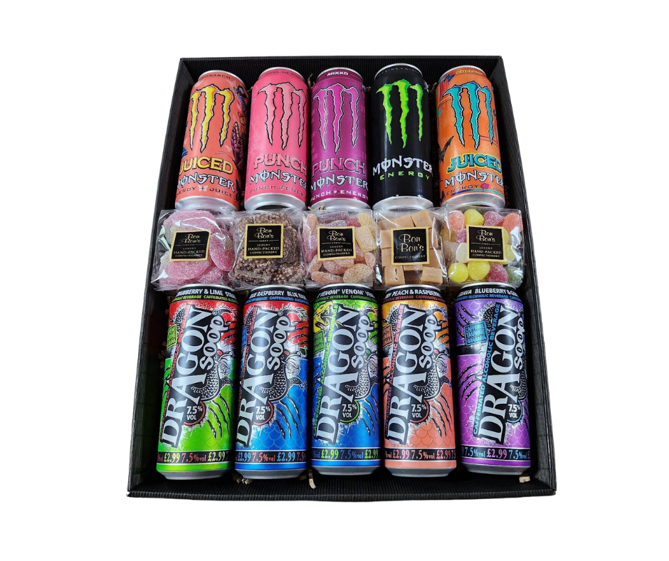When you need that ultimate energy boost with a little extra punch, The Combo Hamper has you covered! Packed with both Monster Energy Drinks and Dragon Soop, it’s the perfect mix of energy and excitement to get you going. We’ve also included sweet treats to satisfy your cravings. Each hamper is carefully hand-packed and finished with Taste Perthshire ribbon and a luxury bow. Inside, you’ll find:
