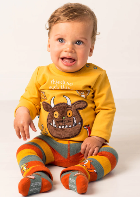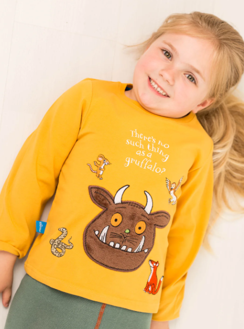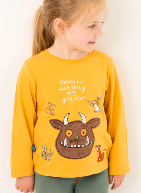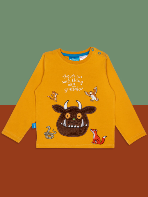 This mustard top features a fluffy friendly Gruffalo face with his woodland friends print on the front.