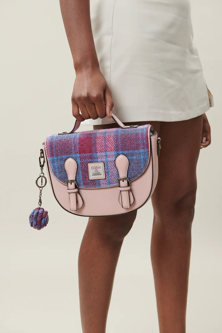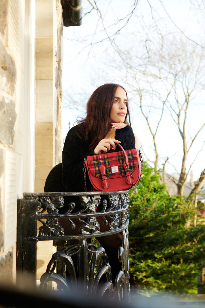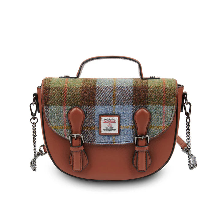 Meet the Medium Cobble Satchel—an homage to the historic streets of Edinburgh and a delightful addition to our collection. Crafted with a microfibre leather body and featuring a front panel adorned with Harris Tweed® cloth, this satchel exudes a blend of modernity and classic charm. Accompanied by an adjustable shoulder strap, please note that it now features a stylish metal chain (pictures coming soon). Complete with inner and outer pockets, this satchel seamlessly combines functionality with a touch of timeless elegance.