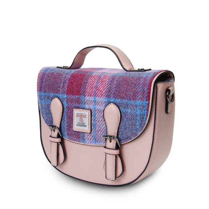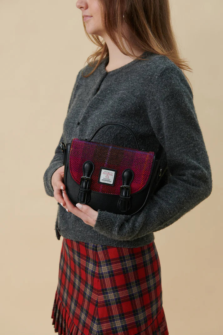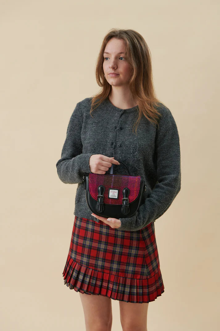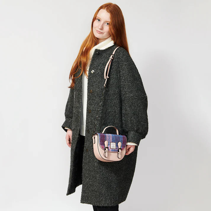 Fashioned with a microfibre leather body and a Harris Tweed® front panel, The Mini Cobble Satchel seamlessly blends contemporary flair with enduring charm. Elevating its allure, the adjustable shoulder strap now features a stylish metal chain (pictures to be revealed soon), lending an extra touch of sophistication. With both inner and outer pockets, this satchel ensures practicality without sacrificing style, making it a charming and functional inclusion in our collection.