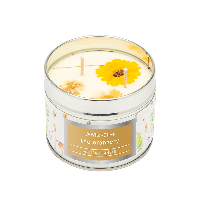 Natural soy candle hand poured and decorated with pressed flowers. Fragranced with the scent of citrus fruits and blossom, oranges and limes.