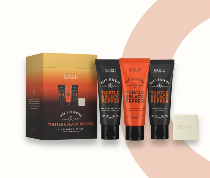 Immerse yourself in the essence of the Scottish Highlands with the Thistle & Black Pepper Signature Gift Set. Infused with soothing milk thistle and the bold scent of pepper, amber and musk, this set includes Face & Beard Wash, Hair & Body Wash, Moisturiser and Body Bar. Perfect for a complete grooming routine, it leaves you feeling refreshed, refined and ready for the day.
