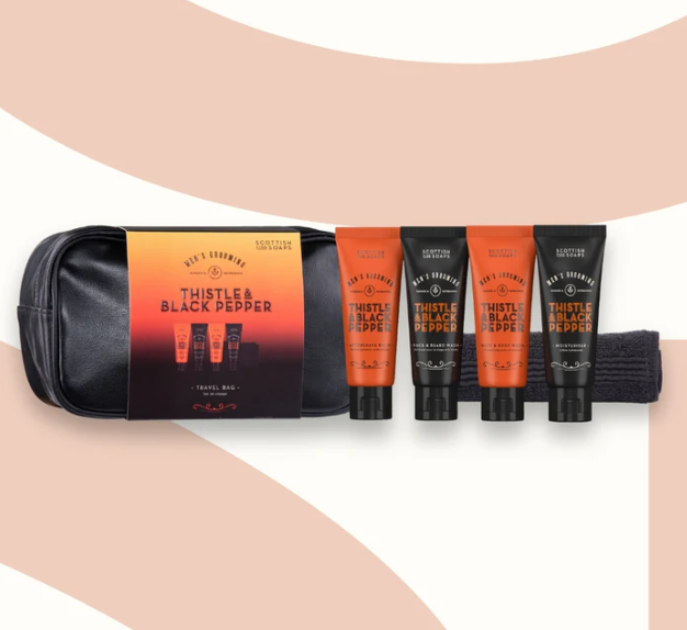 Take the essence of Scotland’s untamed beauty wherever you go with the Thistle & Black Pepper Travel Bag. This sleek black washbag includes travel-sized essentials: Hair & Body Wash, Moisturiser, Aftershave Balm and Face & Beard Wash. Infused with the bold fragrance of black pepper, amber and citrus, this set ensures you stay refreshed and well-groomed, no matter the destination.
