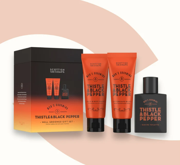 Inspired by Scotland’s untamed beauty, the Thistle & Black Pepper Well Groomed Gift Set offers the perfect blend of sophistication and practicality. This set includes a 50ml Eau de Toilette, 75ml Aftershave Balm and 75ml Hair & Body Wash, all infused with the bold and refreshing scent of pepper and citrus combined with warm notes of amber and sandalwood. Designed to leave you feeling sharp, refreshed and ready for any occasion, it’s the ultimate gift for the modern gentleman. Perfect gift for men.