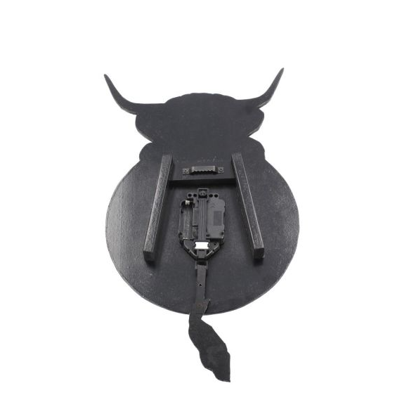 The face f the clock features the image of wooded slats. Over the top, a curious Highland Cow peers at you, ears erect & alert as he continues to chew his hay. Below the clock, the Cow's tail hangs down and swings as the clock's pendulum.